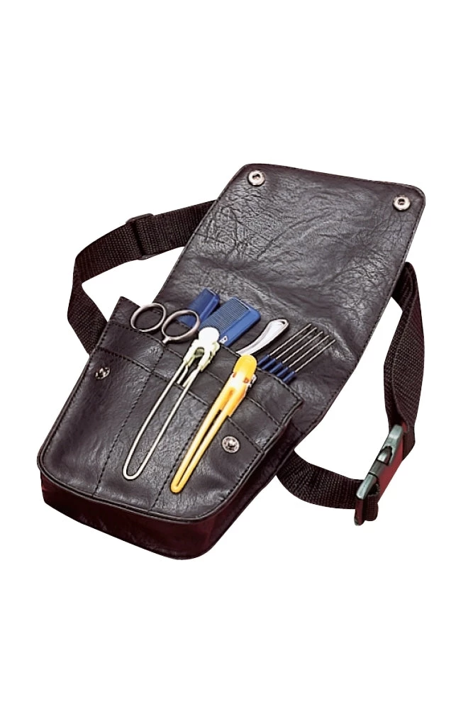 Black Leather Pouch with 6 pockets, large flip compartment & clip-lock waist belt