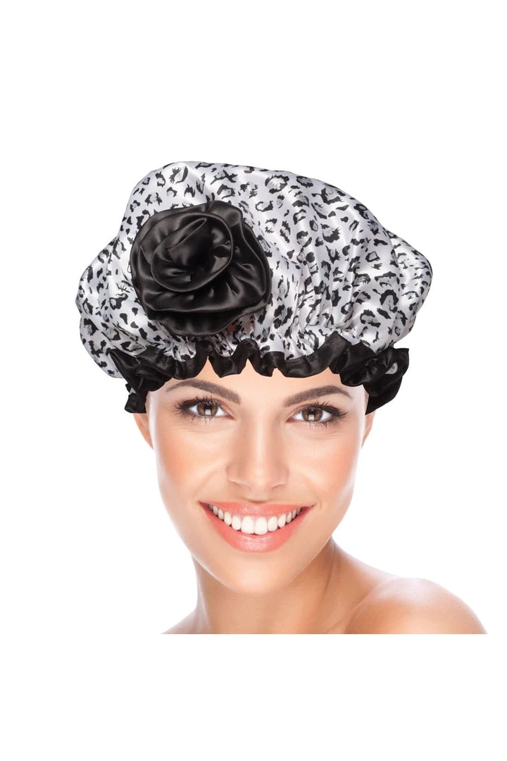 The BeautyPRO Cheetah Shower Cap makes a stylish statement. The ruched satin design features a waterproof lining to keep hair protected. Generous one size fits all, including long or thick hair. Antibacterial shower cap for optimal hygiene.