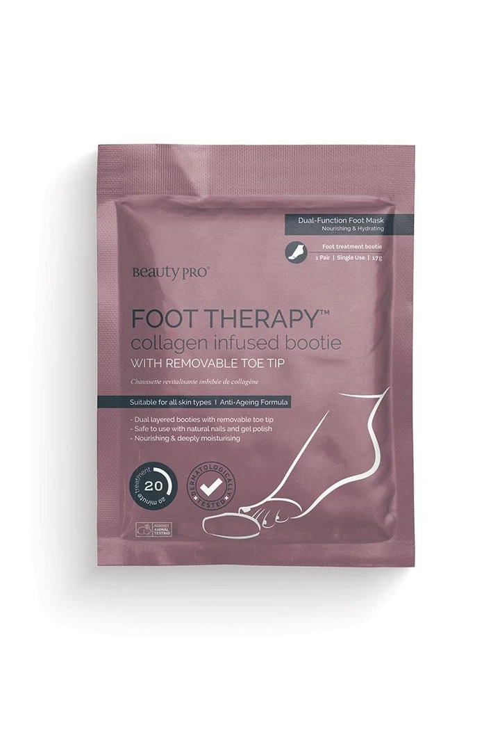 Foot Therapy is a dual layered anti-ageing treatment bootie combined with marine collagen, cooling peppermint and fruit extracts to nourish and deeply moisturise.