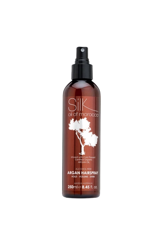 Silk Oil of Morocco Argan Hairspray is a lightweight fine mist that provides a medium hold, instant shine and volume. Formulated with Soy Protein that helps protect, strengthen and improve hair styling, this versatile non-aerosol and alcohol free hairspray creates a flexible hold without the sticky residue. Enriched with the nourishing and moisturising properties of Cold Pressed Certified Organic Argan Oil and Aloe Vera Juice it is the ideal product to create and set a range of styles.