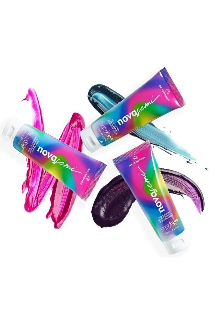New Novasemi professional colour creams are available in the following eight semi-permanent colours and a clear: Volcanic Ash, Hypnotic Pink, Explosive Red, Atomic Orange, Cyber Yellow, Sublime Green, Mystic Blue, Ultra Violet and Crystal Clear.