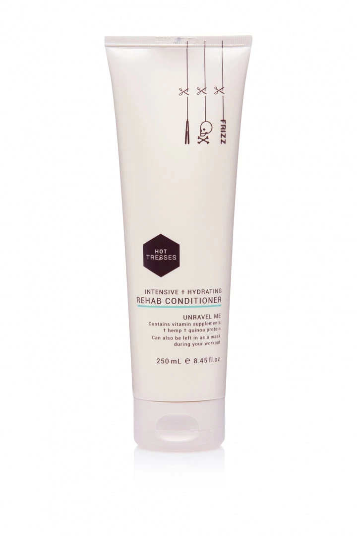 Hot Tresses Intensive Hydrating Rehab Conditioner uses a fusion of anti-ageing, biologically active, cosmeceutical ingredients such as lactobacillus/pumpkin ferment extract, vitamins E and B as well as hemp, quinoa proteins, scalp nurturing rosemary, ylang ylang, castor seed and coconut oils which gently unravel knots and smooth frizz.