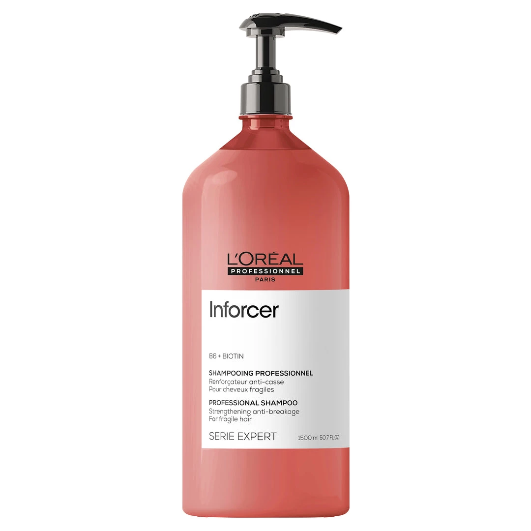 L’Oréal Professionnel’s Inforcer Shampoo transforms fragile and breaking hair. The reinforcing formula is enriched with strengthening properties of Biotin and Vitamin B6, the shampoo gently cleanses daily dirt and impurities while working to restore hair density and resilience.