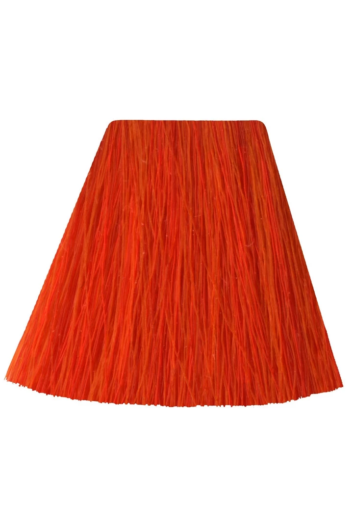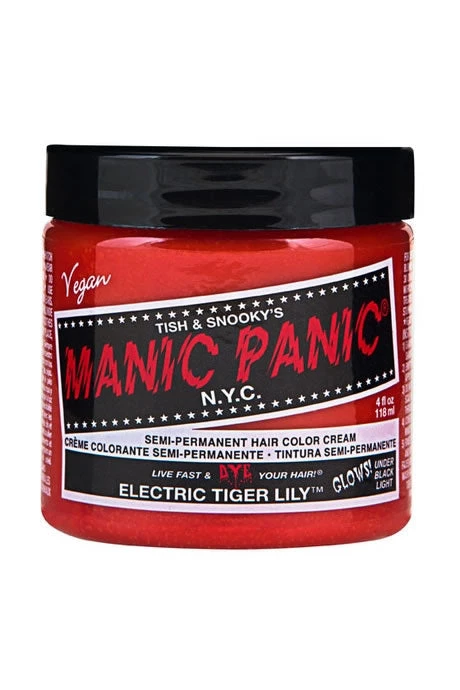 Electric Tiger Lily is a bright and neon shade of orange. Bleaching before dyeing is recommended to get the best results, and for added fun, this color glows under black light. Vibrant color results are best achieved by applying to hair that has been pre-lightened.