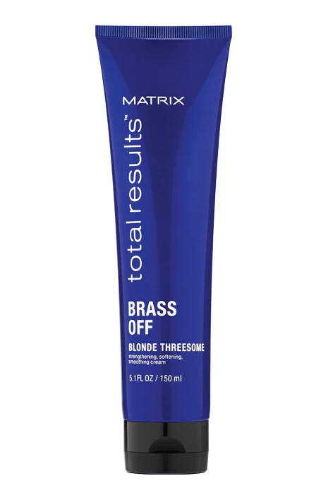 Total Results Brass Off Blonde Threesome softening, smoothing and protecting leave-in cream helps seal cuticles, while protecting strands from heat damage (up to 450F) for soft, touchable hair. The leave-in cream targets specific concerns when darker hair is lifted to a lighter shade. softness, manageability and protection.