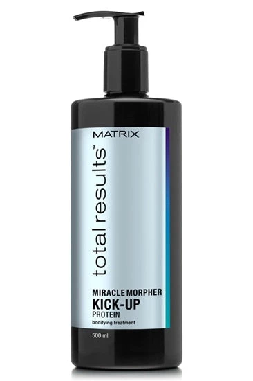 Total Results Kick Up Protein is a backbar concentrate with a powerful dose of plumping protein that targets limp, fine hair types that needs added structure. Formula adds instant lift and restructures hair for body and lasting styles.