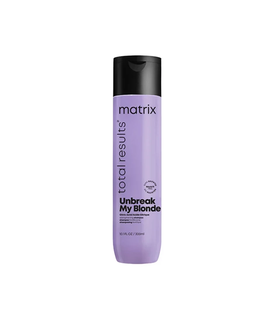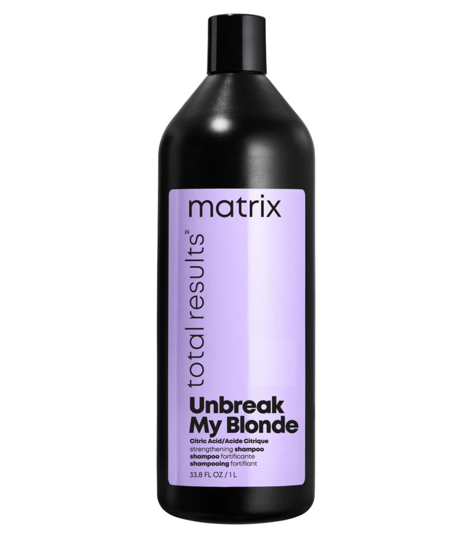 Matrix Total Results Unbreak My Blonde Shampoo is infused with citric acid to gently cleanse sensitive hair. Revives damaged and over-processed hair, leaving hair soft, shiny and 3x stronger!*