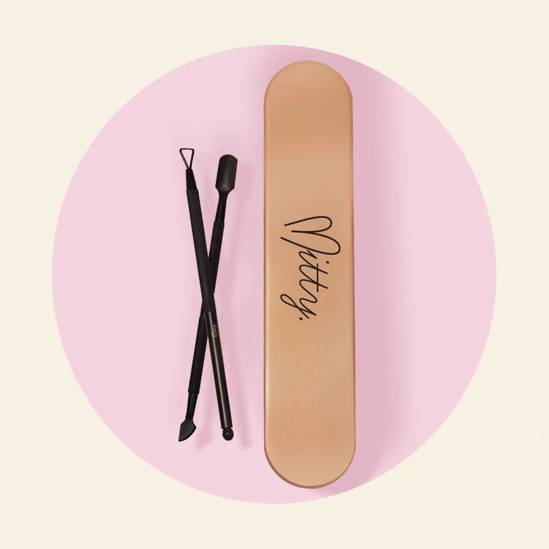 This gel polish scraper & cuticle pusher tool kit is a must have for nail care and easy gel removal. Made from 100% stainless steel, then powder coated matte black, and presented in a rose gold tin.
