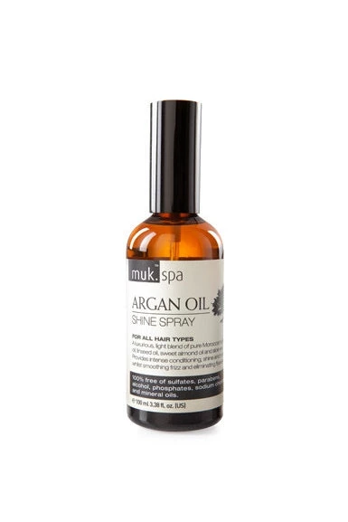 Muk Spa Argan Oil Repair Shine Spray contains a blend of pure Moroccan Argan Oil, linseed oil, sweet almond oil, keratin protein and aloe vera. It provides intense conditioning, shine and moisture to the hair, whilst smoothing frizz and eliminating flyaways.