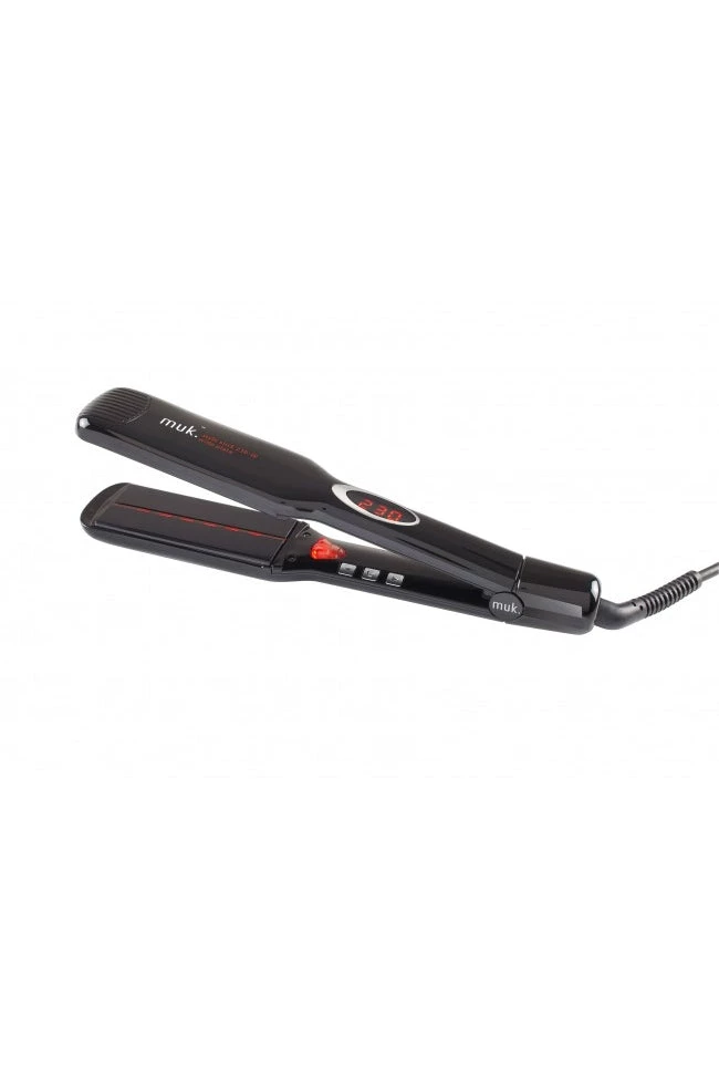 The Muk Style Stick 230-IR Wide Plate utilises a revolutionary strip of powerful far-infrared lights embedded in the wider ceramic plate. These infrared lights infuse a gentle heat deep inside the hair shaft without damaging the cuticle (surface layer) of the hair shaft. The ceramic plate also contains one million more negative ions than regular ceramic/tourmaline plates thus producing amazing shine, moisture balance plus protection from thermal damage. Hair is straightened with a single pass.