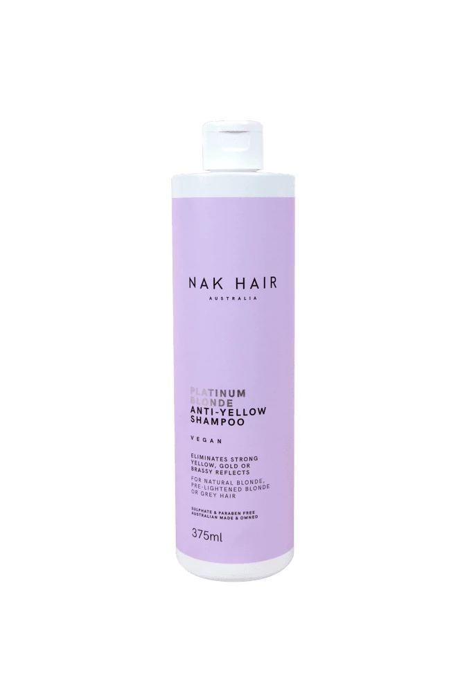Nak Platinum Blonde Anti Yellow Shampoo cancels strong yellow and brassy reflects in blonde hair. Tones blonde hair to create cool platinum silver reflects and per-lighted, blonde and grey.