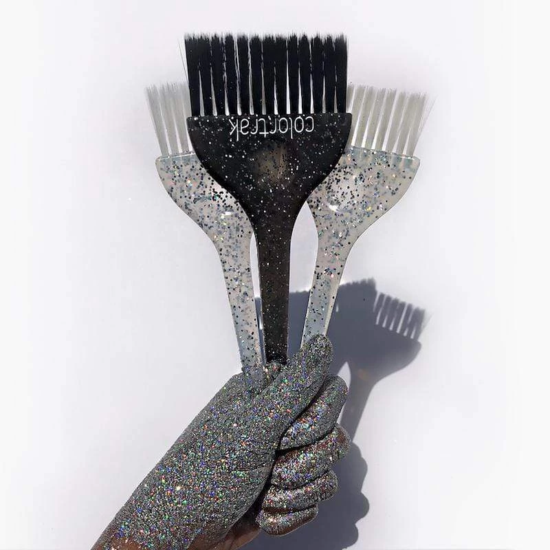 - One EXTRA WIDE glitter brush with silver glitter, perfect for bending the fabric of space-time with fast, smooth application across wider sections of hair.