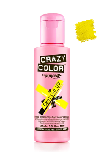 It’s LIT! Caution UV is a highlighter yellow that glows in both natural and UV blacklight. For best results apply to pale or platinum blonde hair.