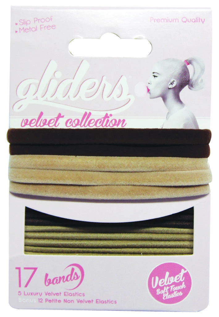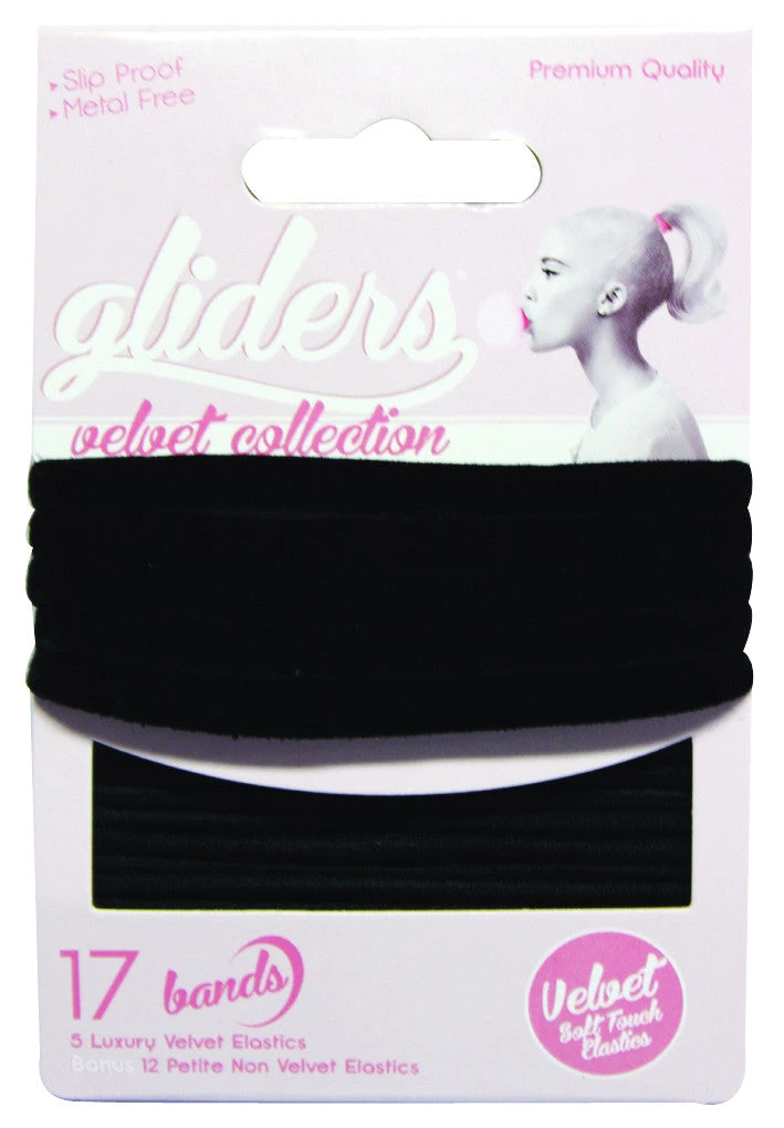 The Velvet Soft Touch Elastics come with 17 hair ties in each pack – Five luxury velvet ties and a bonus 12 petite non-velvet elastics.