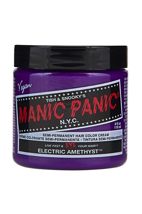 To achieve the popular and coveted bright lavender hair, use Manic Panic’s dye in Electric Amethyst. Because it is one of the lighter shades, bleaching before dyeing is definitely recommended. Vibrant color results are best achieved by applying to hair that has been pre-lightened.