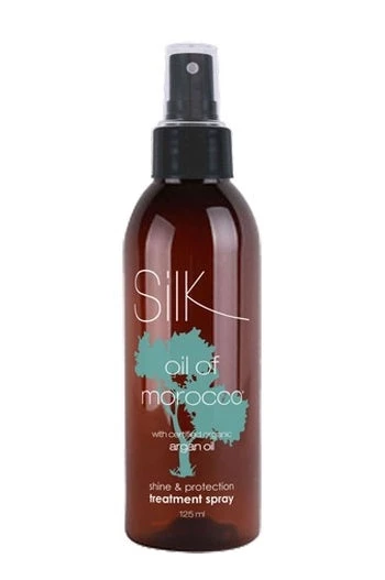 Silk Oil of Morocco Thermal Protection & Shine Treatment Spray is infused with Certified Organic Argan Oil. Appliances like blow dryers, curling & crimping irons, thermal brushes and straightening irons all reduce the moisture in your hair and in most cases weaken the hair, increasing the chances of hair breakage. Oil of Morocco Thermal Protection & Shine spray protects hair from damaging heat allowing you to style your hair without the nasty side effects. The light formula is instantly absorbed by the hair with no residue. Leaving the hair beautifully hydrated, soft and shiny. Oil of Morocco Thermal Treatment has the ability to restore the hair from both chemical and environmental damage.
