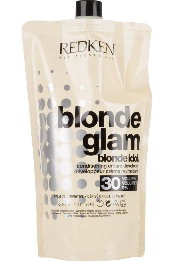 Blonde Glam Conditioning Cream Developer contains conditioning palm oil derivative, which combines with the white beeswax in the lightener to form Cire-Gloss for luminous shine on lightened hair.