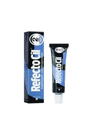Refectocil Eyelash and eyebrow tint No. 2 Blue Black is a black colour with a blue lustre providing additional colour depth to the tinting result. Refectocil No. 2 Blue Black tints each hair blue black and makes the eyelashes look clearly longer and more voluminous. The shade Refectocil No. 2 Blue Black is suitable for clients who wish “somewhat more” than pure black; it goes very well with certain skin types and when using blue eye make-up. With this colour you can enhance brown or black eyelashes and eyebrows or tint light or white eyelashes and eyebrows with long-lasting blue black. Clients with dyed blue black hair can match their eyebrows with their hair colour using Refectocil No. 2 Blue Black.
