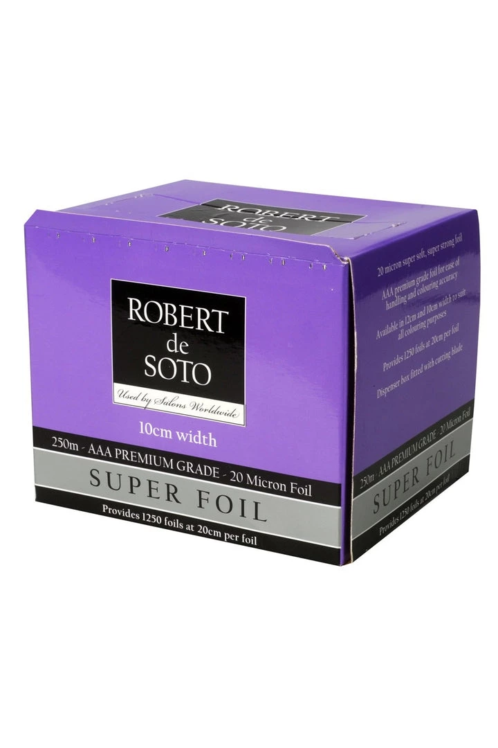 Super soft, super strong, super economical! Robert de Soto introduces 250m rolls of 20 micron soft flexible foil to give you the best of both worlds. The softness and flexibility of 15 micron foil and the ease of handling and durability of 20 micron foil. Provides 1250 foils at 20cm per foil and packaged in a dispenser box with cutting blade for your convenience.