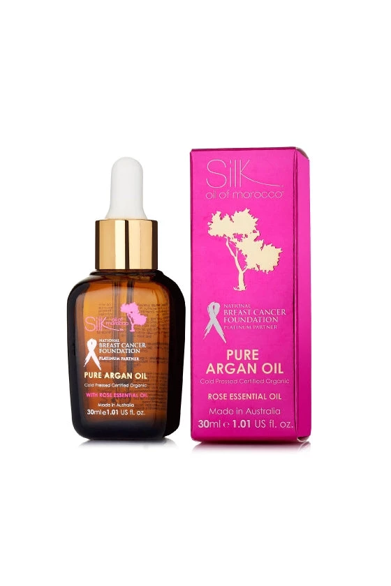 Silk Oil of Morocco’s Pure Argan Oil infused with a beautiful floral and sweet aroma of Rose Essential Oil exudes moisture and hydration delivering great nurturing benefits to skin. This exquisite pure oil is preservative free, absorbs quickly and leaves no greasy residue. Boasting 98% Cold Pressed Certified Organic Argan Oil rich in vitamins and antioxidants to be used on a variety of skin concerns. Instantly hydrate your skin whilst supporting the National Breast Cancer Foundation.