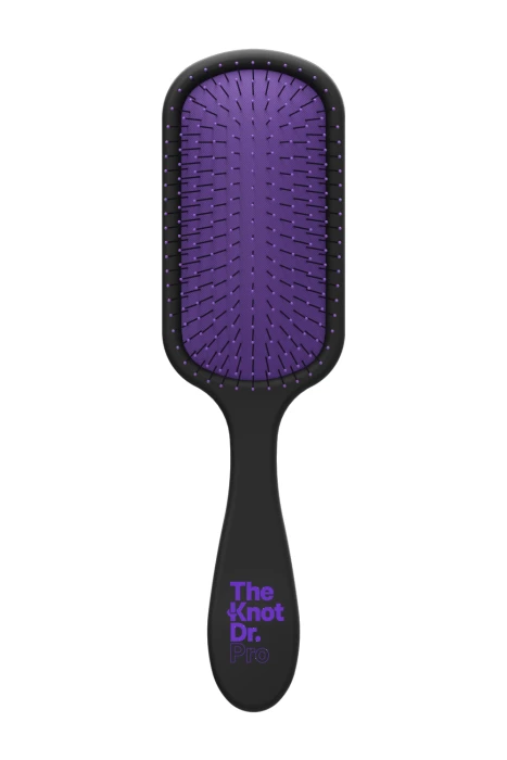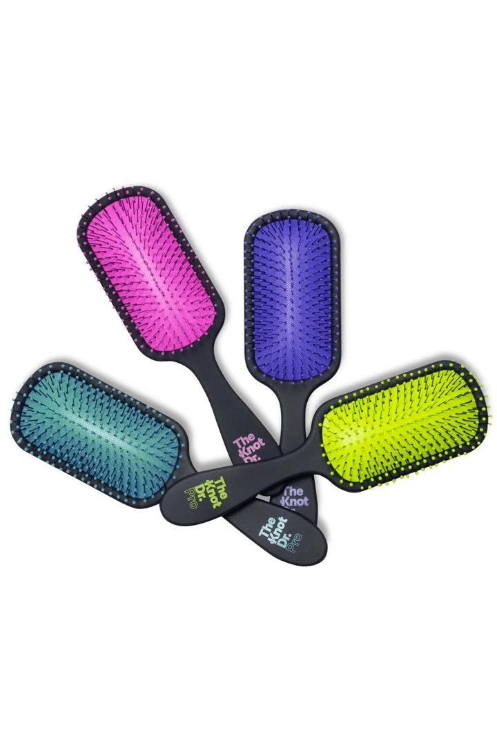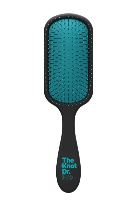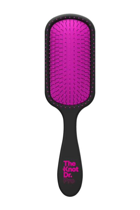 The Knot Dr.Pro is a paddle brush boasting 212 bristles. The spread of this impressive bristle count across the paddle allows for maximum coverage and creates an enjoyable detangling experience. The Pro brush has a sleek black, carbon body with brightly coloured pad and bristle tips.